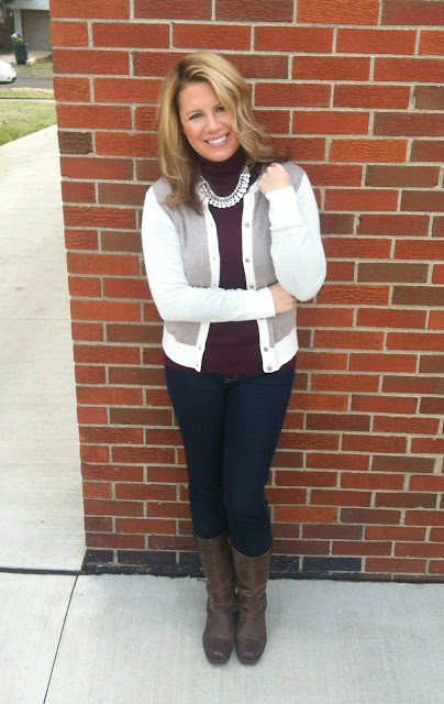 This is a pretty typical work outfit for me. Sweater, skinny pants, boots...done!